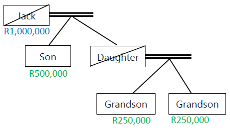 Jack passes away intestate, leaving an estate of R1,000,000. He had a son and a daughter. His daughter died 2 years prior, leaving 2 children of her own. His son will inherit R500,000. His predeceased daughter’s R500,000 will devolve upon her children, who will each receive R250,000.
