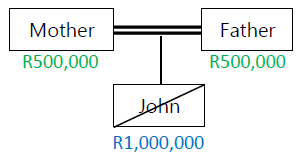 John passes away intestate, leaving an estate of R1,000,000. He has no descendants or surviving spouse, but is survived by both parents. His parents will each inherit R500,000.