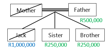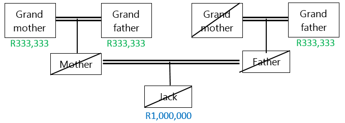Jack passes away intestate, leaving an estate of R1,000,000. He has no descendants or surviving spouse, but is survived by his father. His mother is predeceased but his parents had 3 children, Jack (the deceased) and two siblings.  His father will receive one half share being R500,000. The remaining half, which should have gone to his mother, is now divided equally among her descendants. His siblings will each receive R250,000.