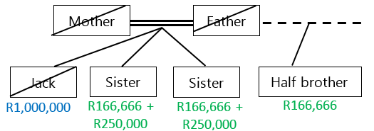 Jack passes away intestate, leaving an estate of R1,000,000. He has no descendants, no surviving spouse and no parent. He has sisters and a half blood brother, from his father’s side. His predeceased mother’s R500,000 will devolve upon her 2 remaining children (the 2 sisters), who will each receive R250,000. His predeceased father’s share of R500,000 will devolve upon his 3 children, who will each receive R166,666.