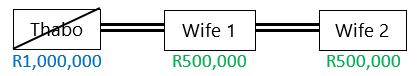 Thabo passes away intestate, leaving an estate of R1,000,000. He was married to two wives. His wives share equally in his estate and each inherit R500,000.