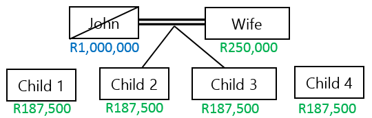 John passes away intestate, leaving an estate of R1,000,000. He had a wife and 4 children. In John’s estate, a child’s share would be R200,000:
